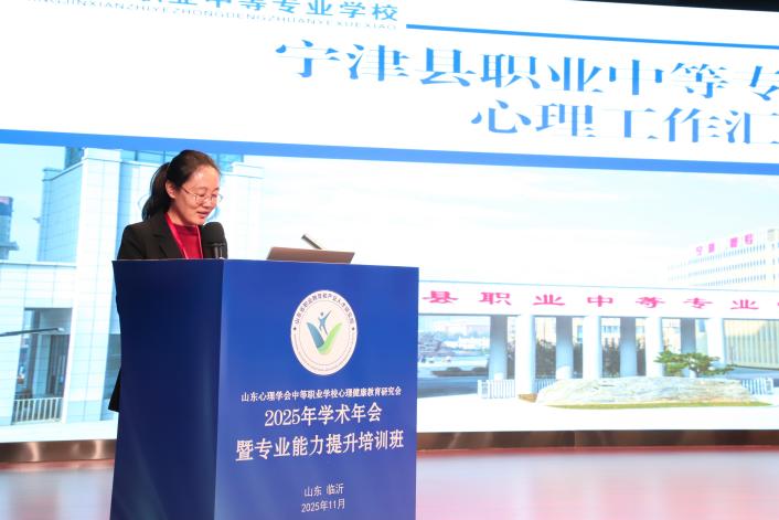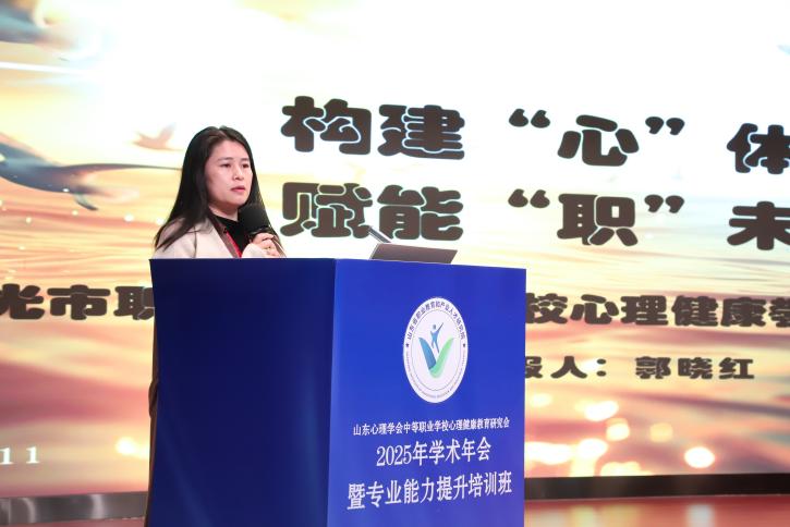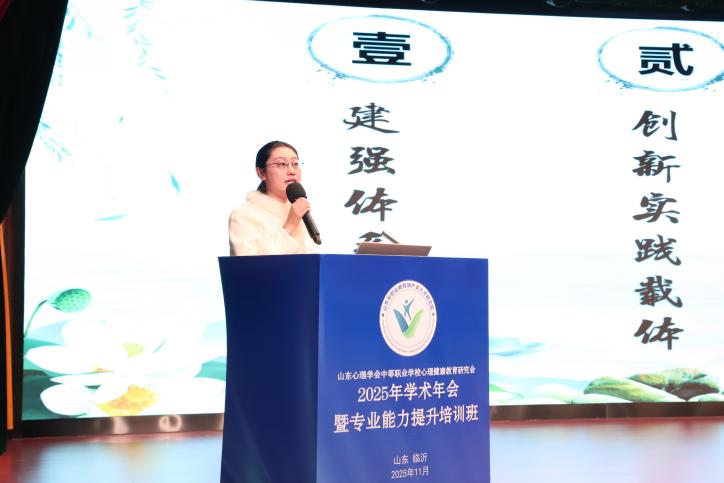 梁玉菡代表临沂市教育局致辞,她指出,此次年会于临沂举办,将有力推动临沂中职学校心理健康教育工作的开展,临沂将紧扣时代脉搏,聚焦AI技术与心理教育的融合创新,积极探索具有区域特色和职教特点的心理健康教育路径。
